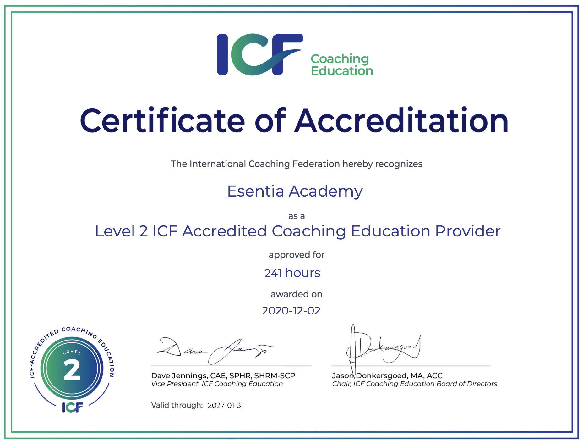 Esentia Akademi, “Professional Coaching Certificate Program” Level-2 düzeyinde ICF akreditasyonuna sahiptir ve yaşam koçluğu eğitiminde ICF temel yetkinliklerine uygun şekilde, her insanın muazzam bir potansiyel olduğundan hareketle farklılığa değer veren ve yargılamak yerine anlamaya odaklanan bir anlayışla hazırlanmıştır. ICF Koçluk Eğitimi Sertifika Programımız, Thomas Leonard’ın oluşturduğu koçluk esaslarına bağlı kalarak Fritz Perls’in Gestalt ekolünü benimsemiştir. Ayrıca Bilişsel Davranışçı Koçluk ve NLP tekniklerinin koçluğa uyarlanmış etkili yöntemlerini barındırmaktadır.
